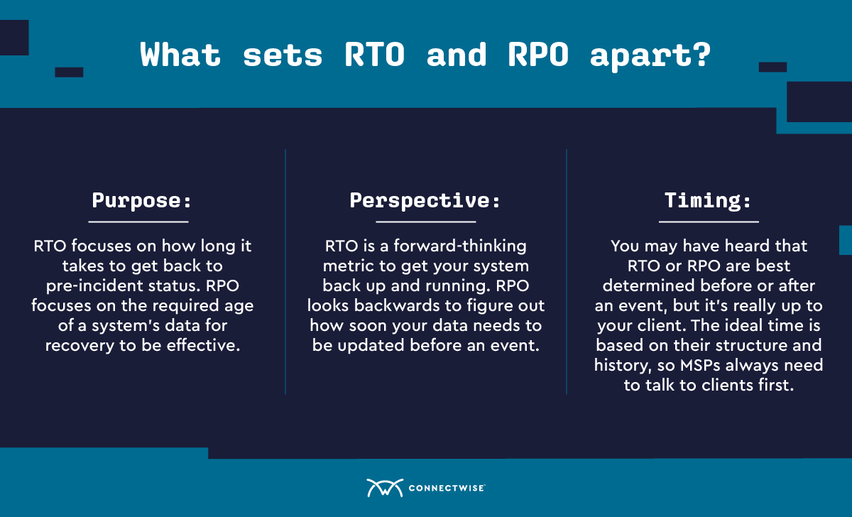 We hope that now you understand the differences between RTO vs. RPO. But, that’s just a tiny part of the larger puzzle that makes up proper BDR protocols. For more in-depth knowledge on how each of these concepts fits into an overall BDR plan, check out the ConnectWise cybersecurity glossary.